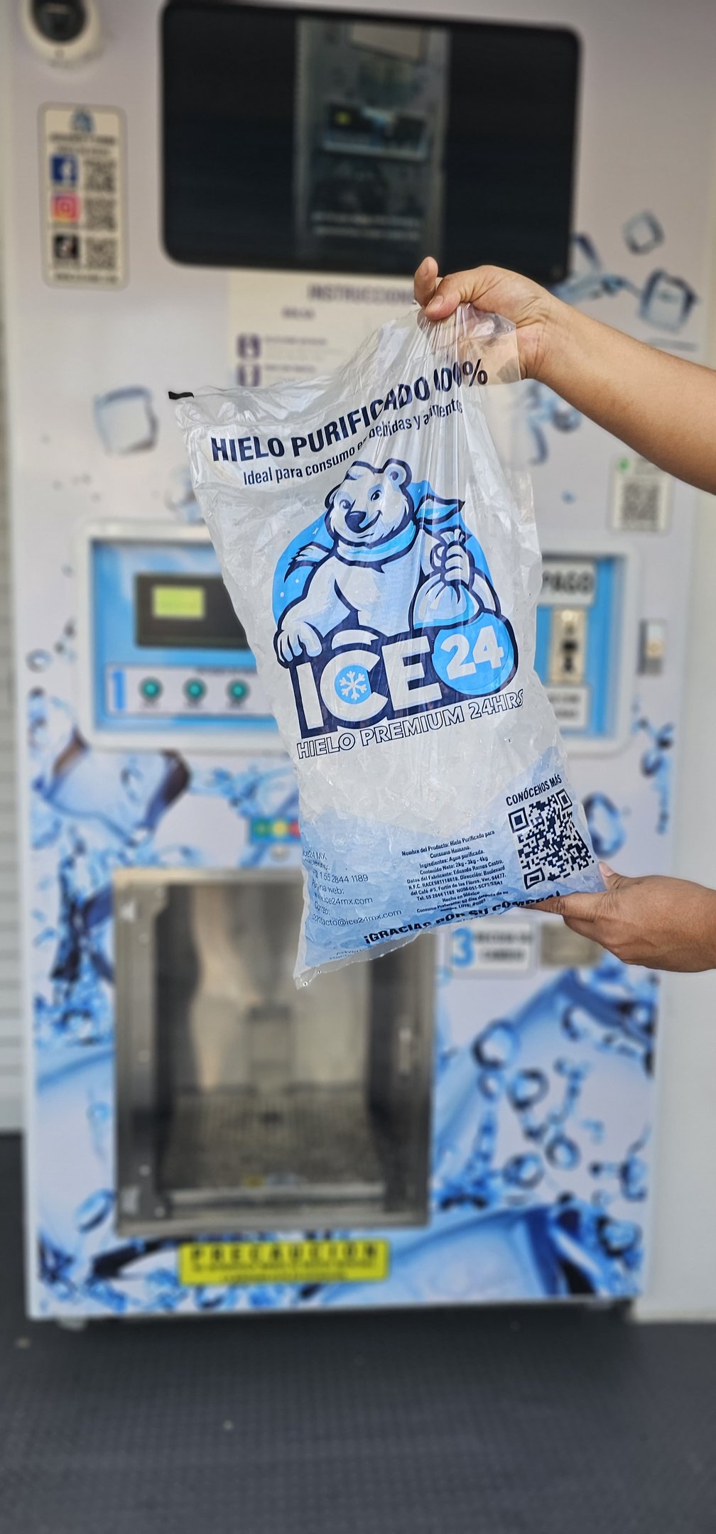 En ICE24, cada bolsa de hielo es sellada automáticamente dentro de nuestra máquina, sin contacto humano. Esta innovadora tecnología asegura un producto higiénico, rápido y completamente seguro, con la comodidad de obtenerlo al instante.